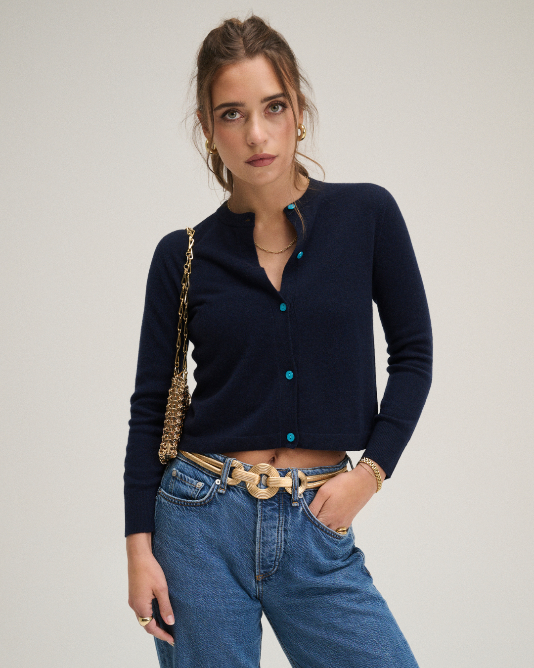 A timeless, versatile classic that layers beautifully with just about any outfit. Features a scoop neckline, slim fit, and slightly cropped silhouette. Pairs elegantly with the CHAM bandeau for an effortlessly chic look. Knitted from 100% Cashmere.