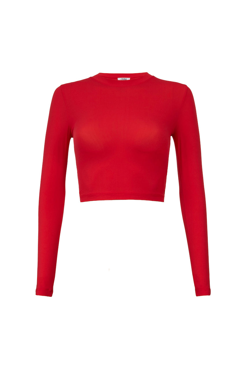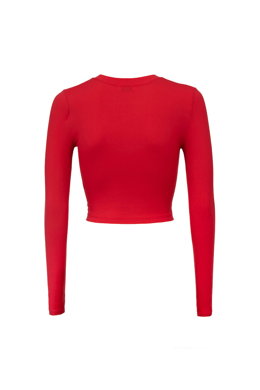 This top, which stops right above the waistline, has a closer fitting crew neck and narrow long sleeves for a seamless fit.